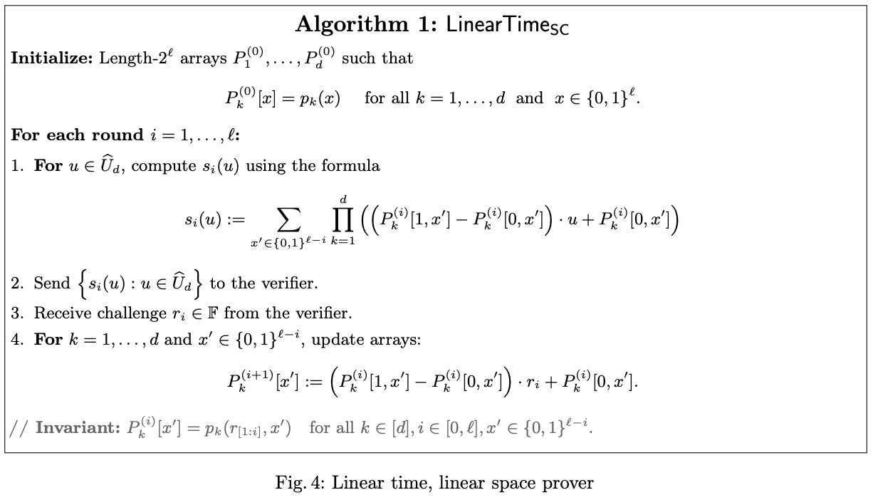 - Step 4 computes (of size ) from (of size ) to maintain the stated invariant, binding one variable to the verifier challenge. The update uses the fact that for any multilinear polynomial , we have . This allows us to bind the variable to any value.