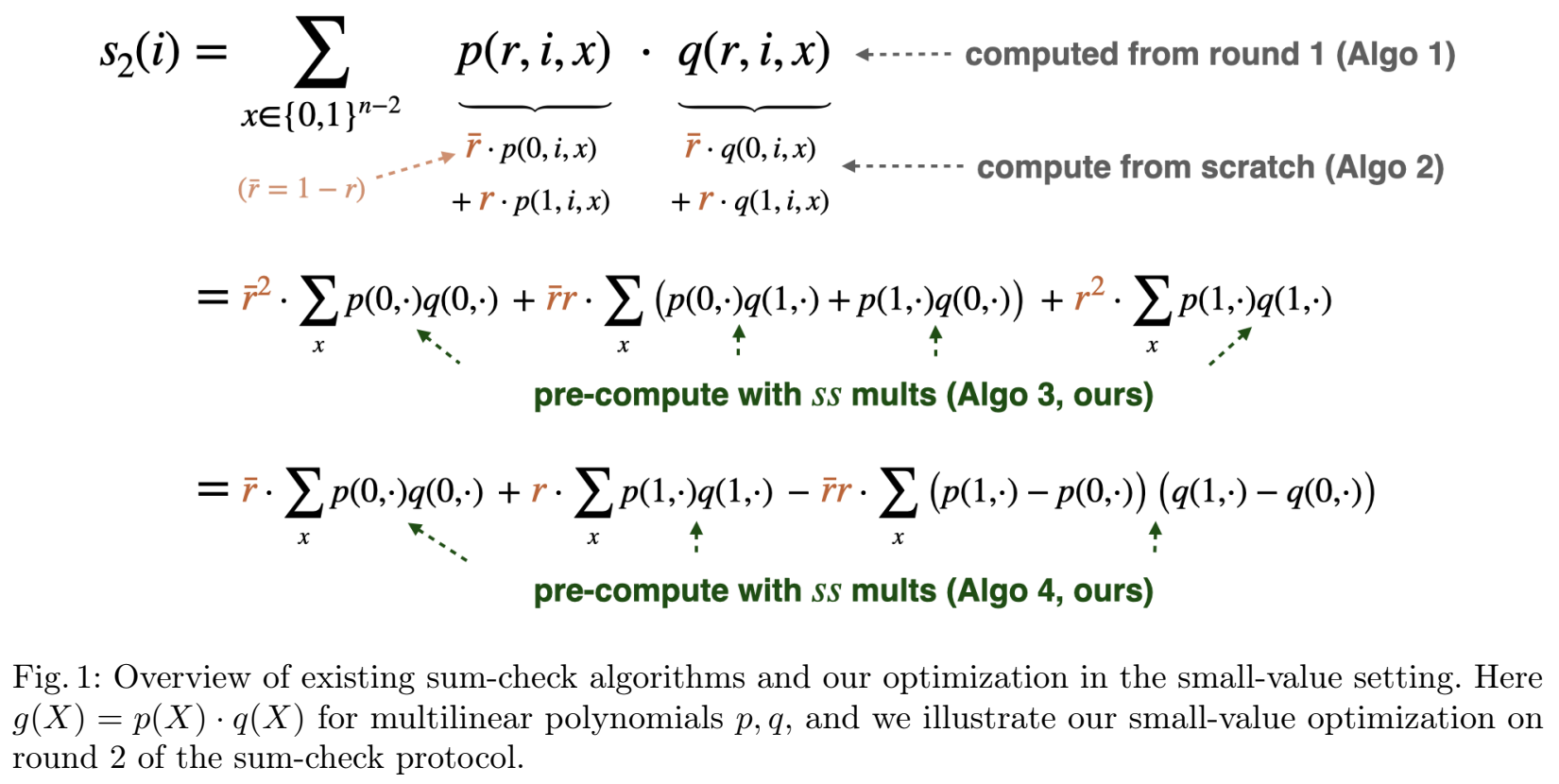 TLDR: Recaps existing proving algorithms, introduces new algorithm to (1) trade off multiplications between large field elements (expensive) for multiplications between small field elements cheap, and (2) optimize for the common case where has as one of its factors, as common in Spartan and Jolt.